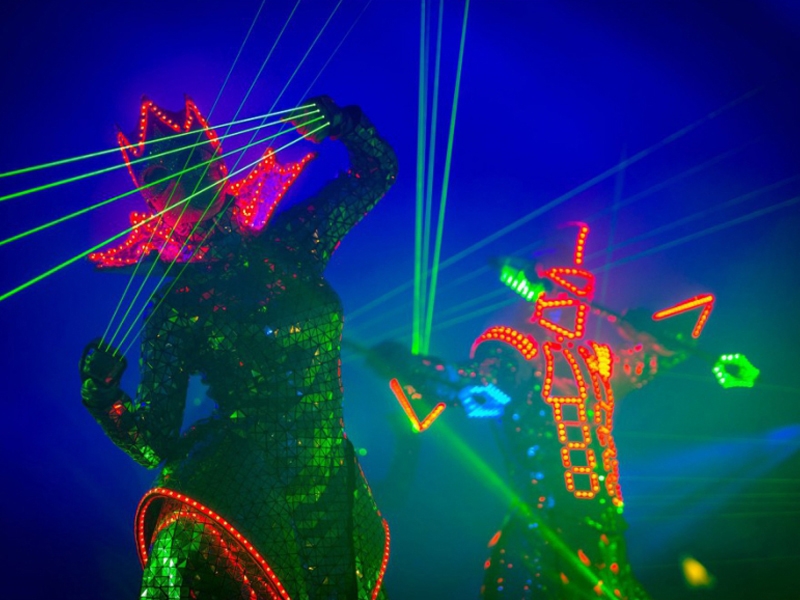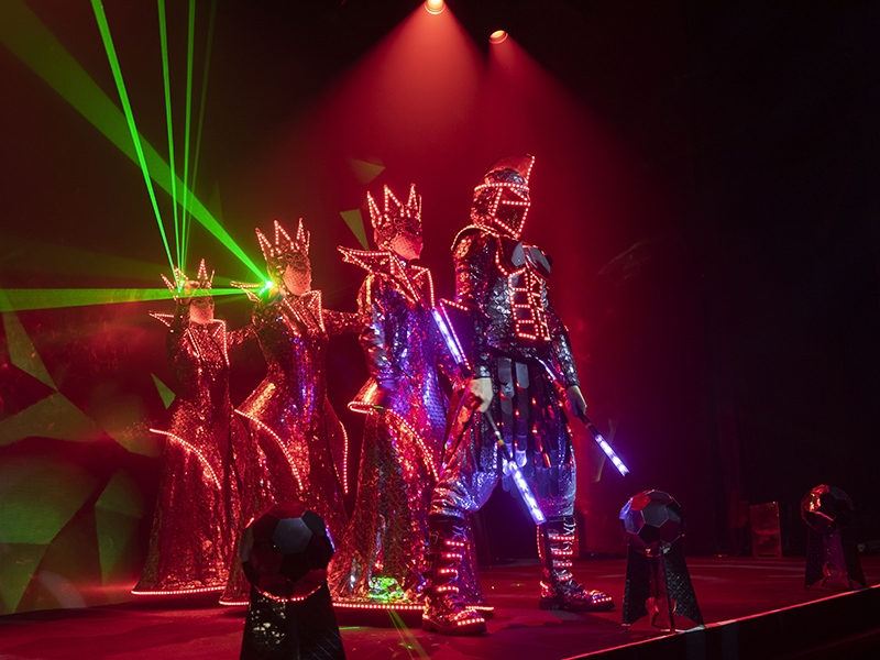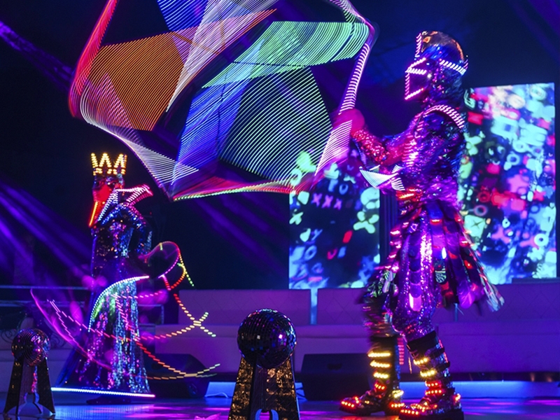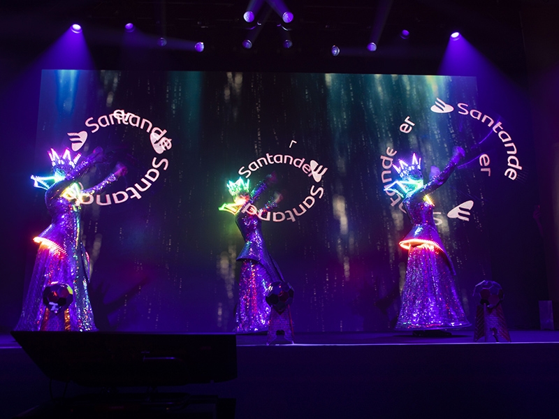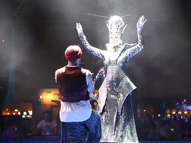 Sparkly show full of light, laser effects and colour led lights, bringing the maximum energy on stage. A stunning clothing made of hundreds of miniature mirrors and a careful look after staging to the smallest detail makes this artistic proposal one of the most striking ones of the moment. Furthermore, it can be personalised with the appearance of a logo or a word right at the end of the show in accordance with the objectives of the event. If the event requires it, there is the option of adding a close up performance, during which our artist can pose with the guests to take pictures, in a real photocall or in a more improvised manner.