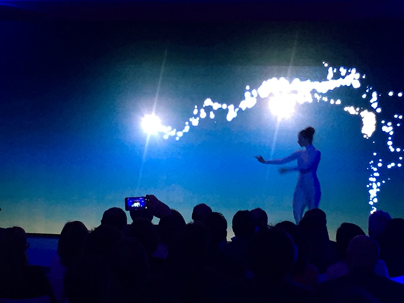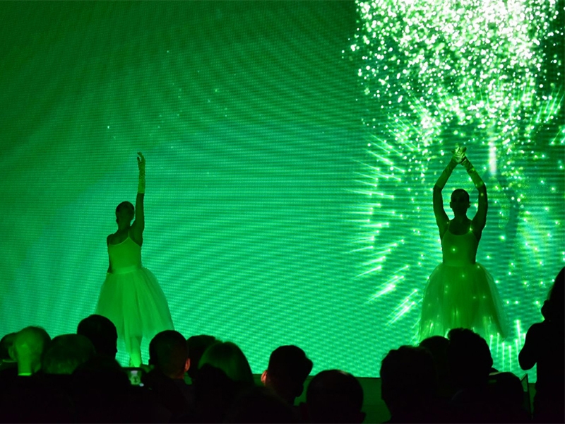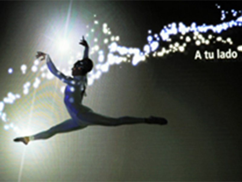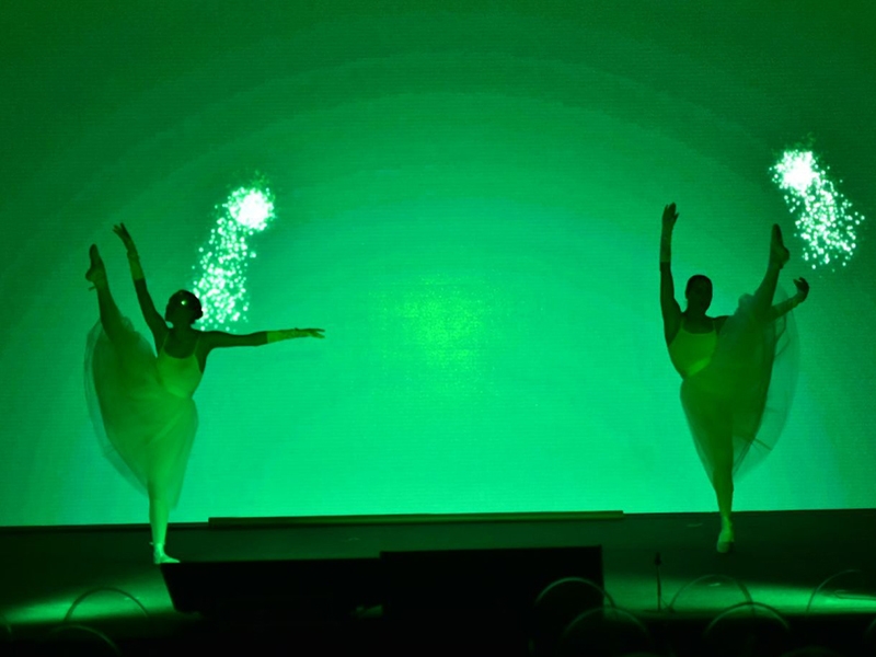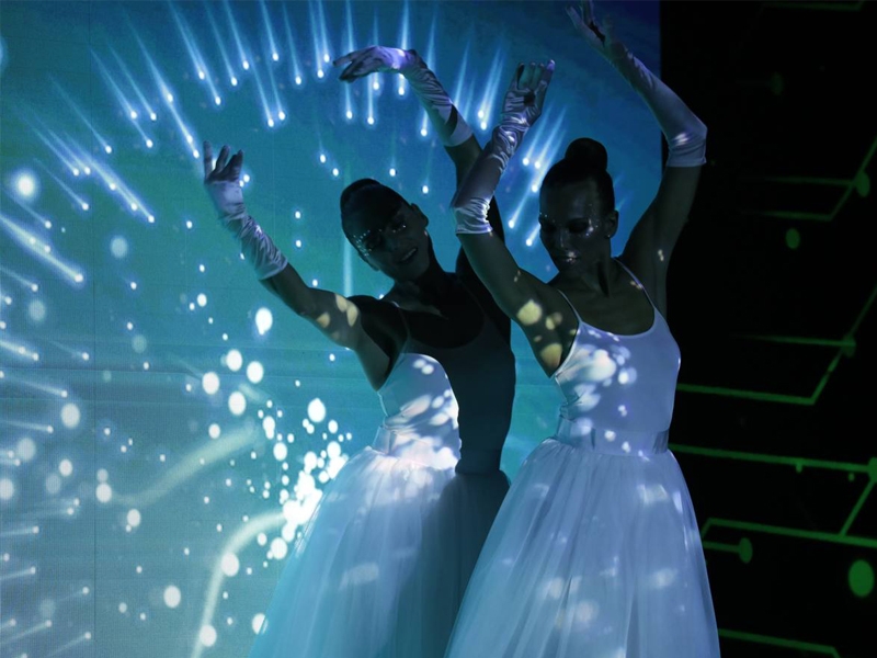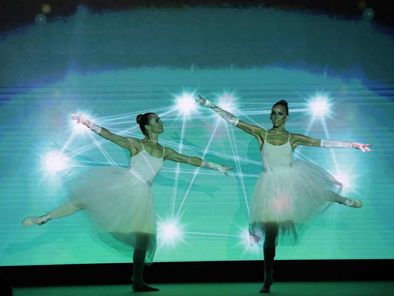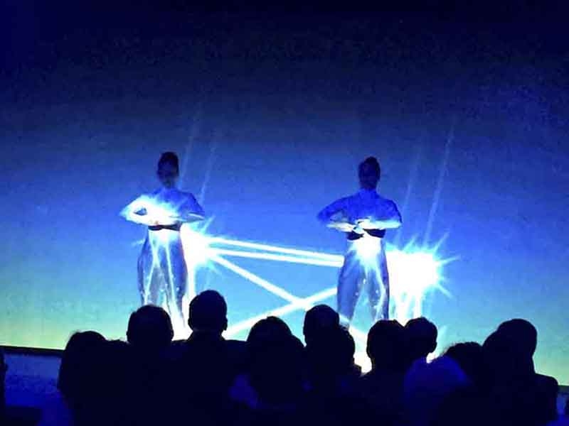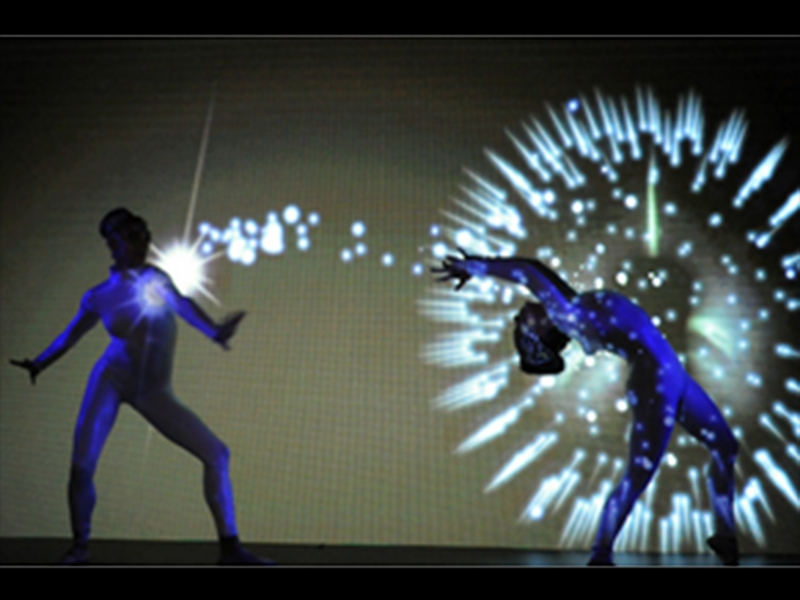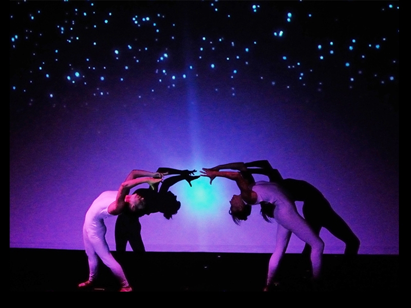 We cross the frontier between fantasy and reality to give a place and an interactives stage where the body and the background mimic each other. Two dancers, in a contemporary dance or ballet format, totally synchronized with the projection of a video, already created, with a mapping effect.