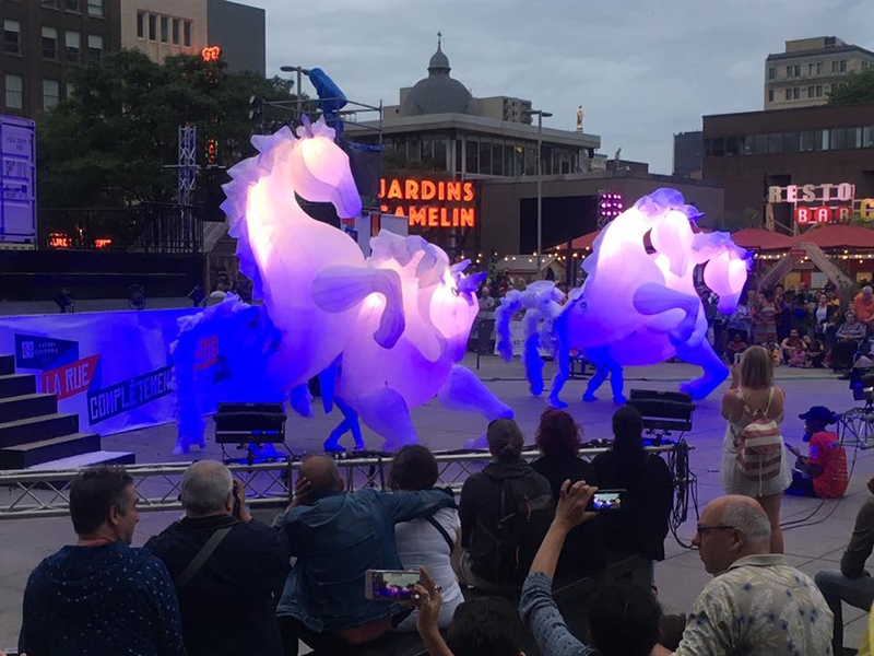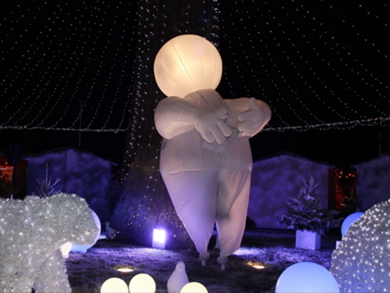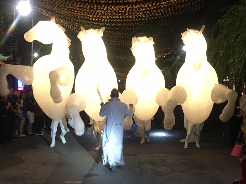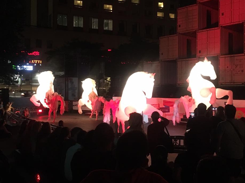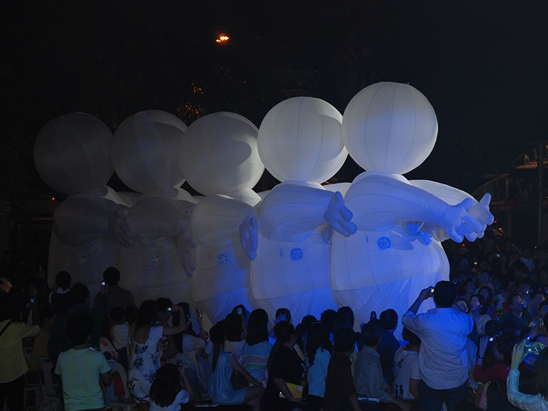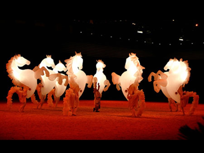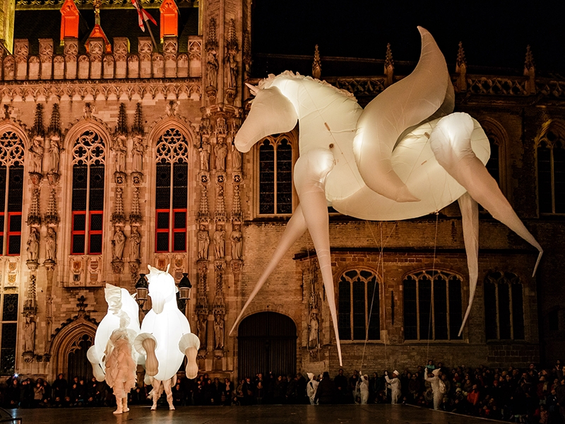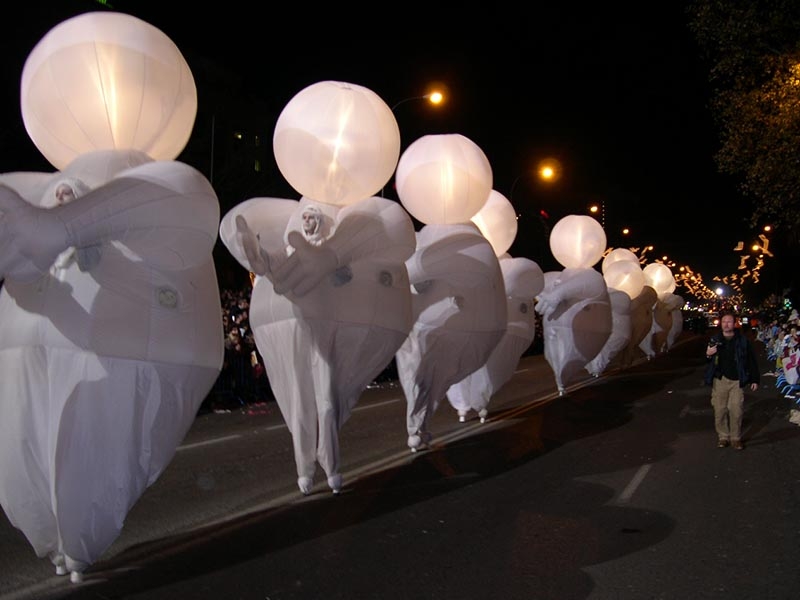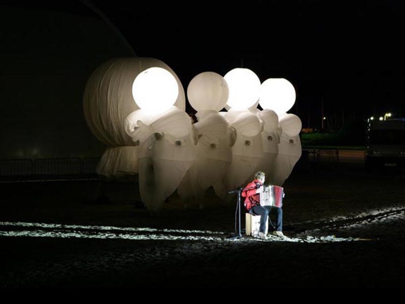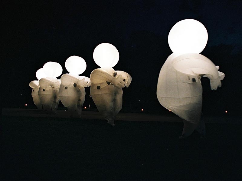 There are giant costumes filled with air and manipulated by an actor. When these mysterious creatures join themselves, the get alive with light and present a magical choreography.