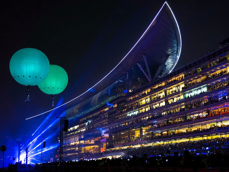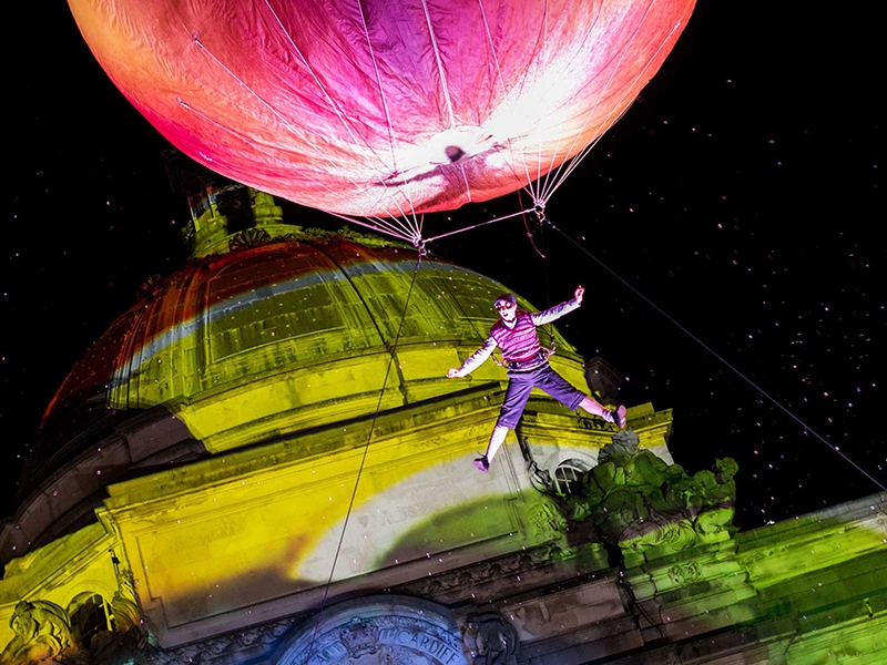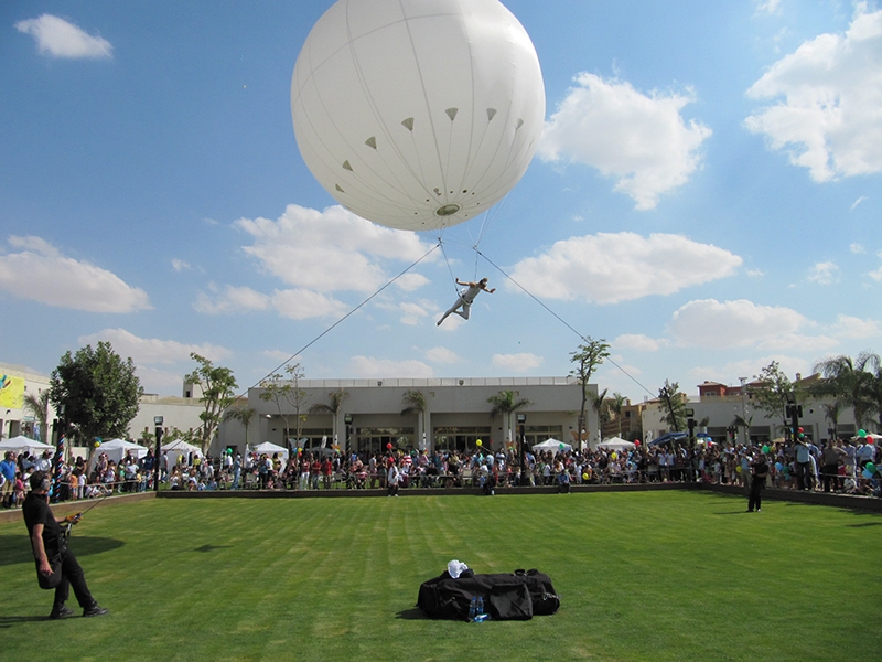 Thinking for promotions and events taking place in spaces of large events. Show where the artist hangs from a helium balloon also has custom lights.