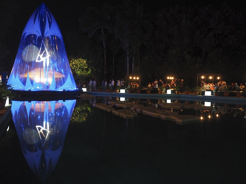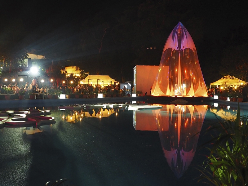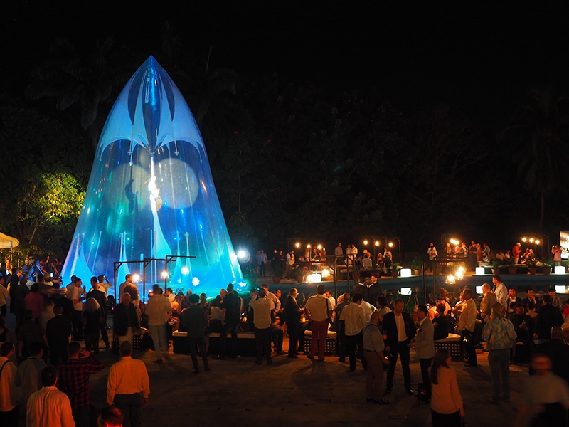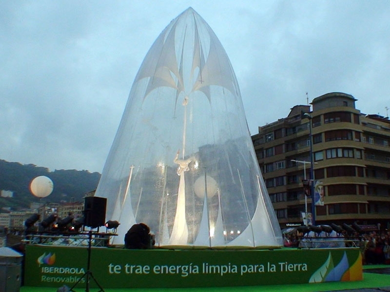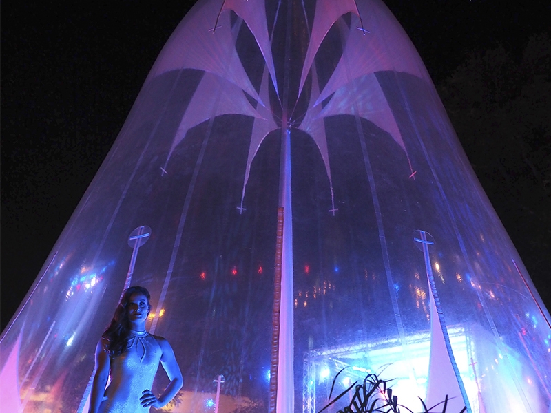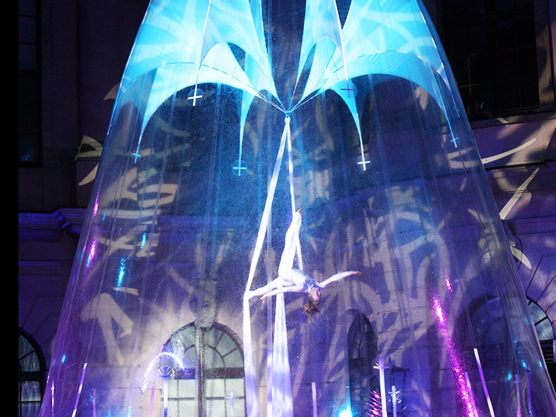 Evoking lines of gothic vaulted ceilings; this structure has resonances from the past but is definitely something from the future. Filling with air from flat, it inverts, and, lifting the aerialist with it, the Diamond creates images of a giant unfolding orchid before achieving a full 11m high, a taut crystalline form. Lighting changes colour on the internal and external facets while the aerialist dances at seven metres high inside.