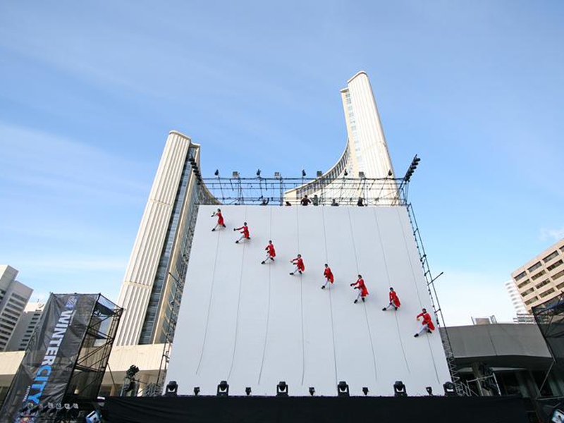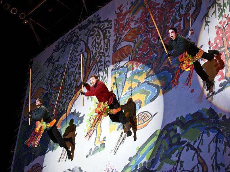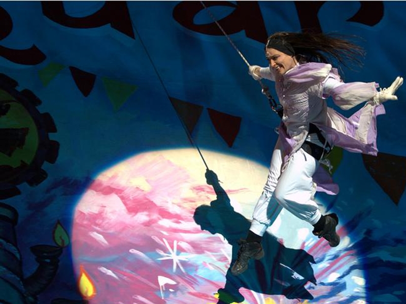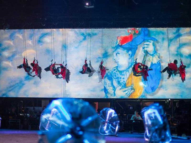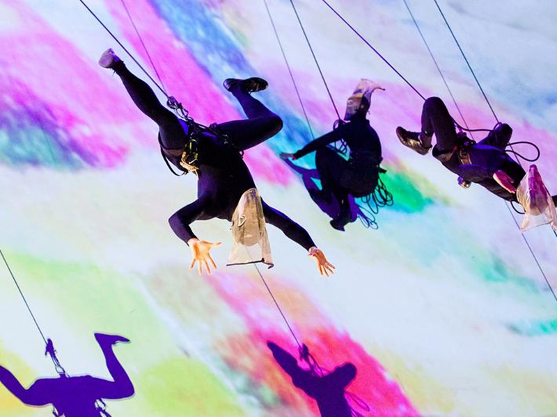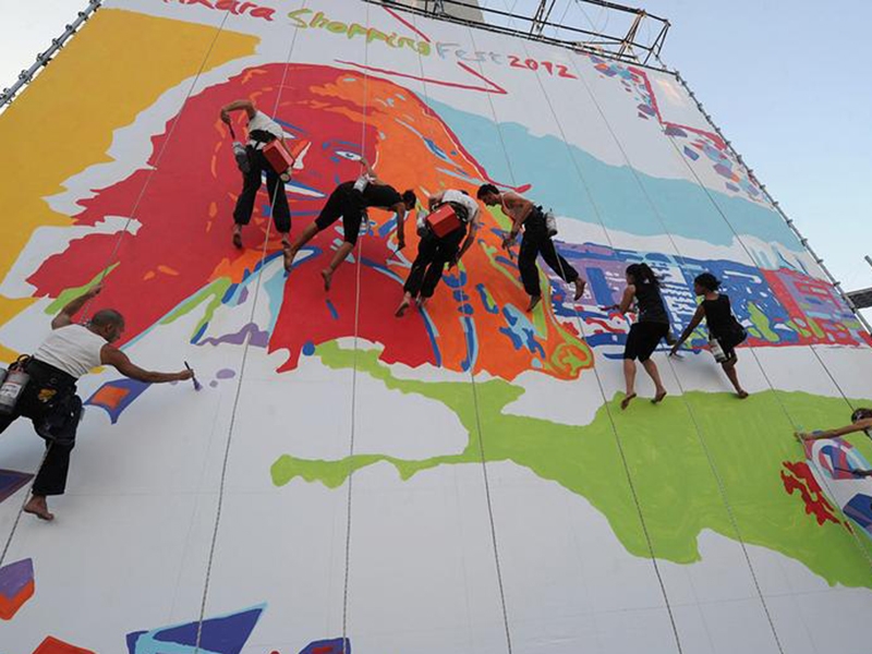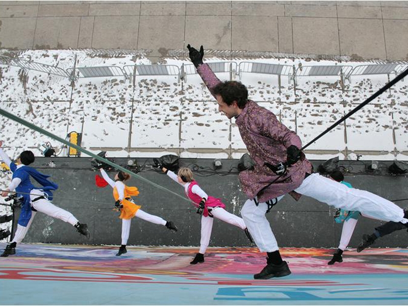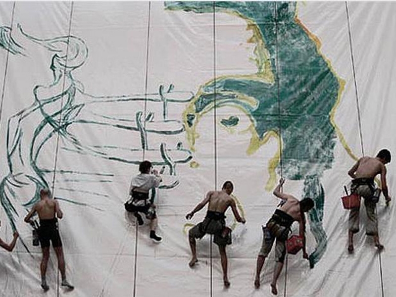 For magnitude events, a group of artists prepare a giant canvas that will be painted during the event. Between an aerial dance and a live painting show, the result is a spectacular fresco, full of colours and made on big dimensions.