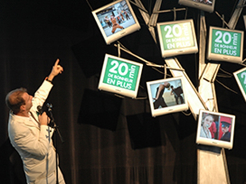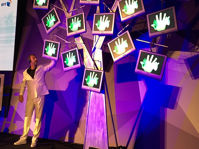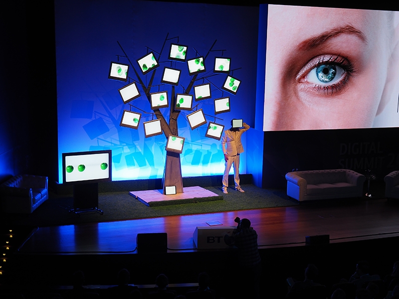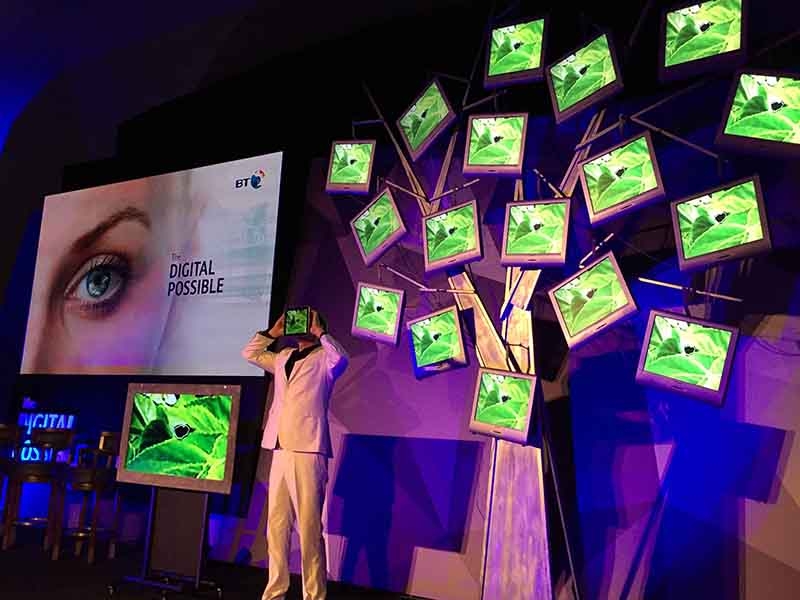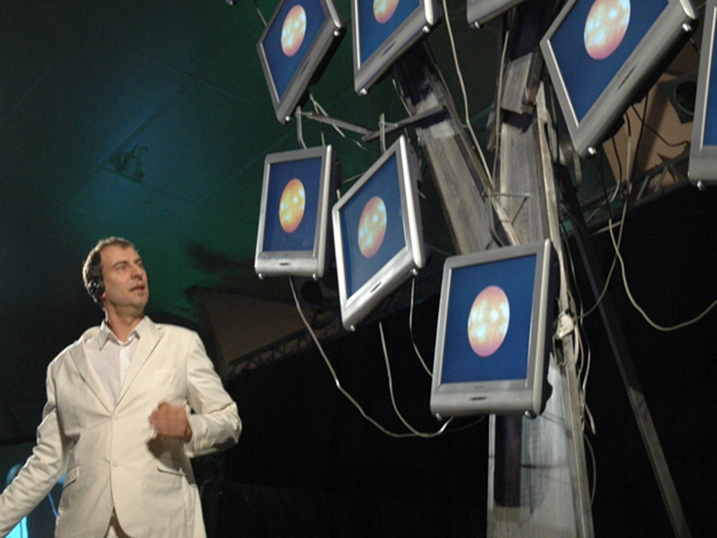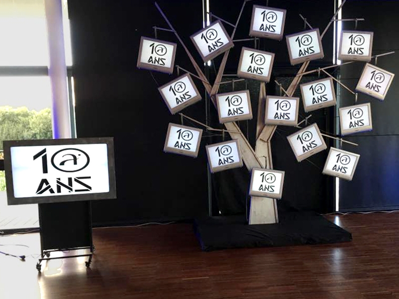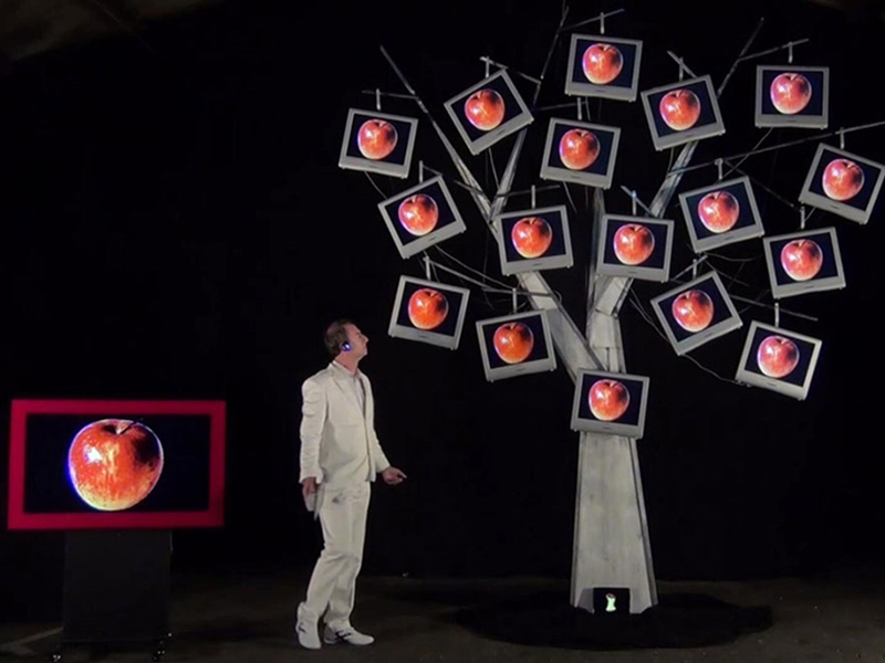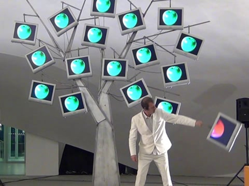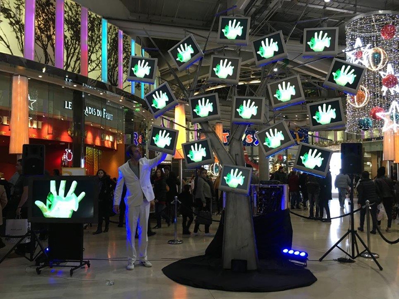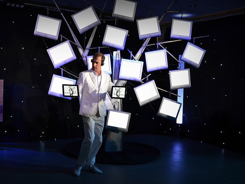 It is a 4 meters high structure, in the form of tree whose leaves are represented by a set of 17 screens. The perfect synchronization between the movements of our performer, the elements, and its journey through the different monitors to reality, creating an enigmatic atmosphere loaded with digital poetry that engages the audience from start to finish.