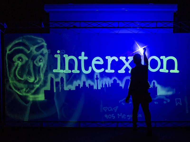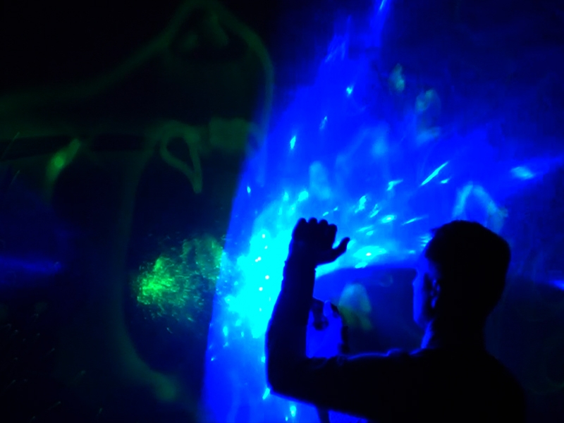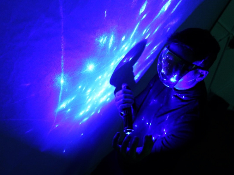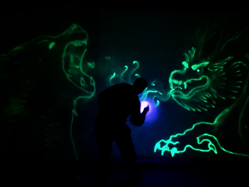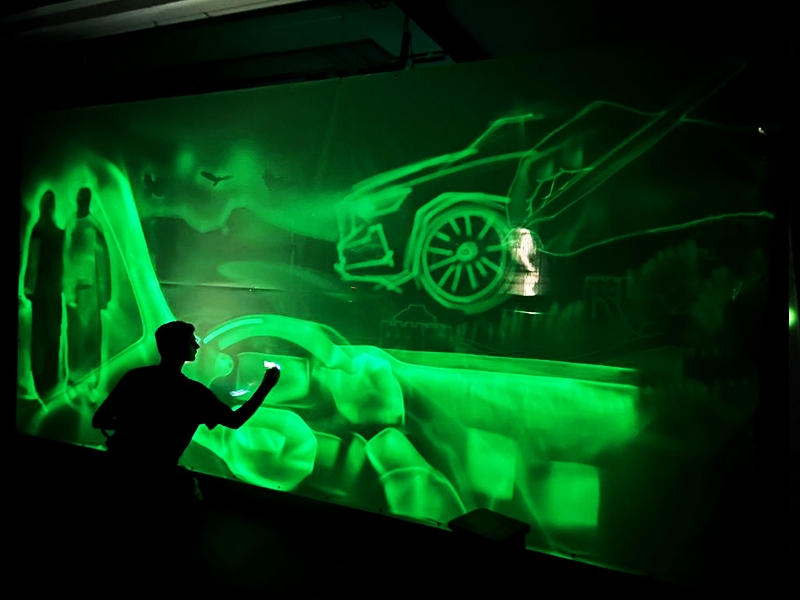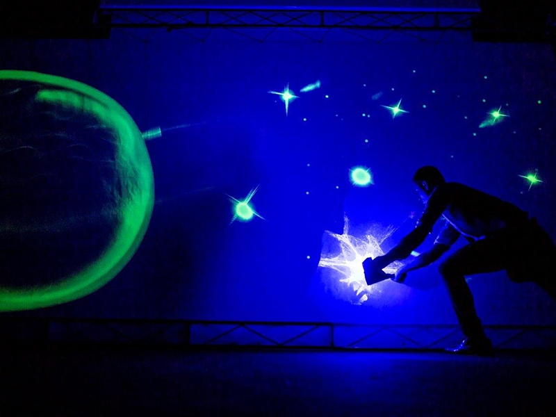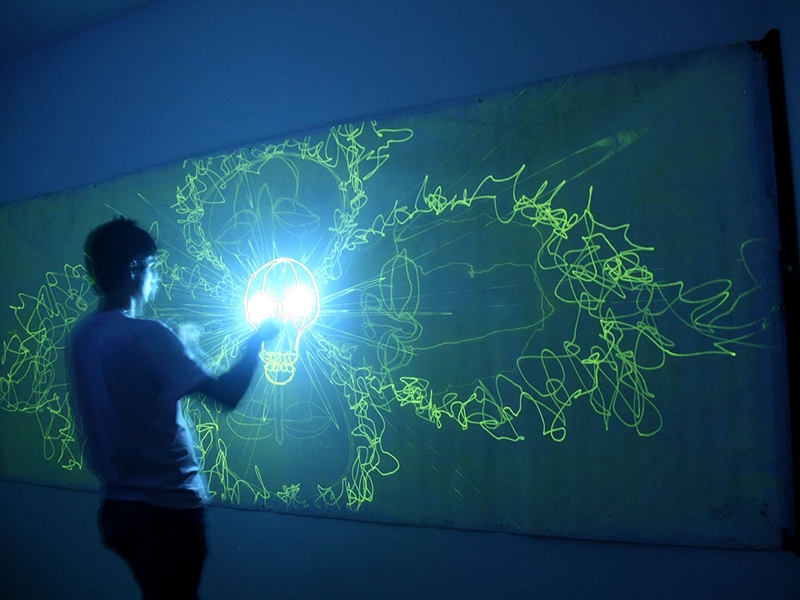 photo-luminescent canvas with very peculiar paintbrushes, lasers and torches. A dynamic and