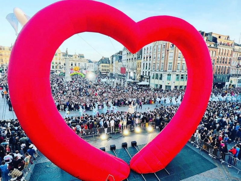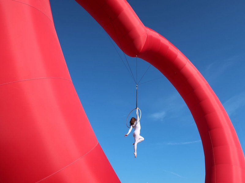 A 12.5m high, air-filled structure that frames an elegant aerial performer. Fluctuations in pressure cause the heart to slowly pulse during the show.